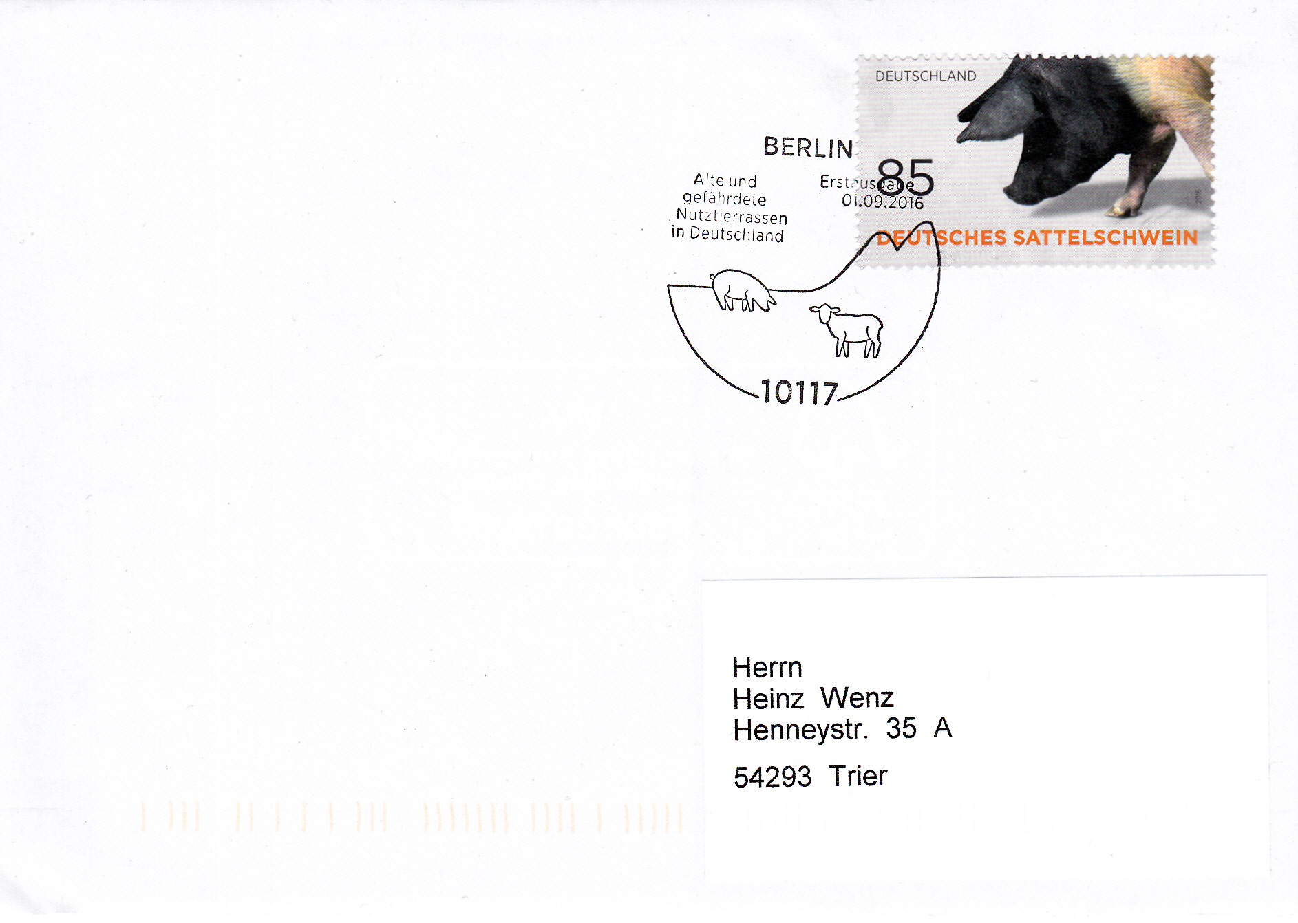 Jetzt folgt die Marke zu 85 Cent aus dem Block auf einem Brief mit dem Ersttagsonderstempel aus Berlin. Im Bild des Stempels werden auch wieder ein Schaf und ein Schwein gezeigt.