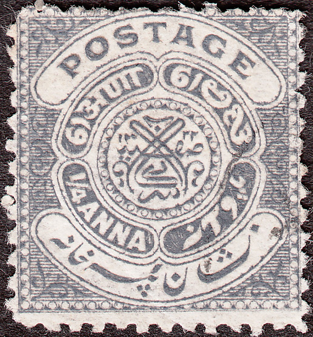 Diese Freimarke zu 1/4 Anna in grau wurde katalogisiert als Hyderabad MiNr. 15: