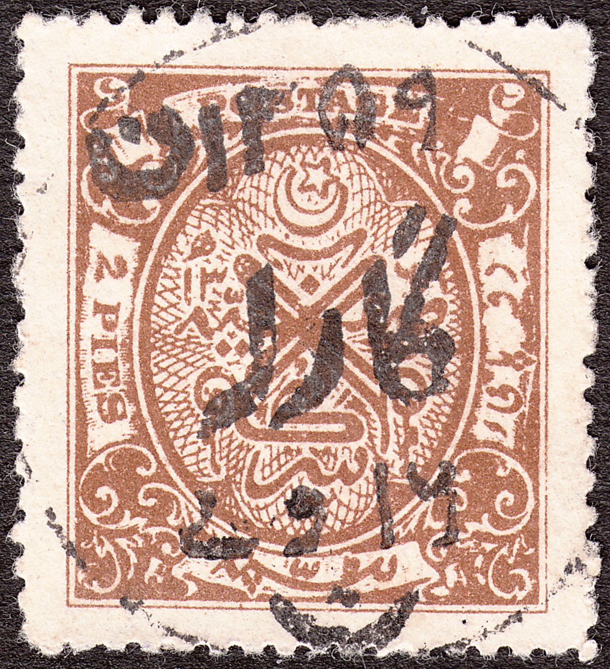 Diese Freimarke zu 2 Pies in gelbbraun wurde katalogisiert als Hyderabad MiNr. 48: