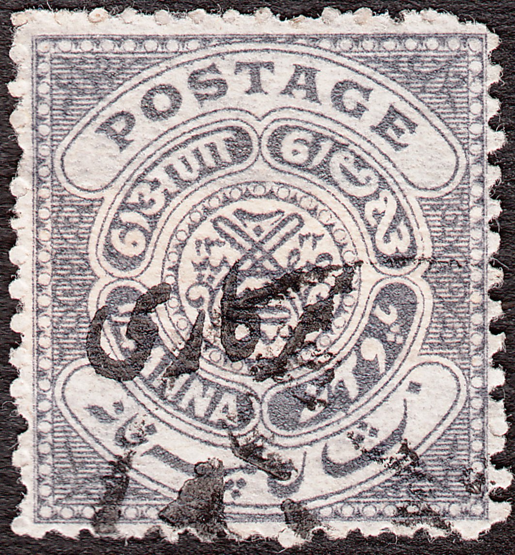 Die Freimarke Hyderabad MiNr. 15 zu 1/4 Anna in Grau wurde mit schwarzem Aufdruck Sarkari = Dienst versehen als Dienstmarke Hyderabad MiNr. D 22 ausgegeben: