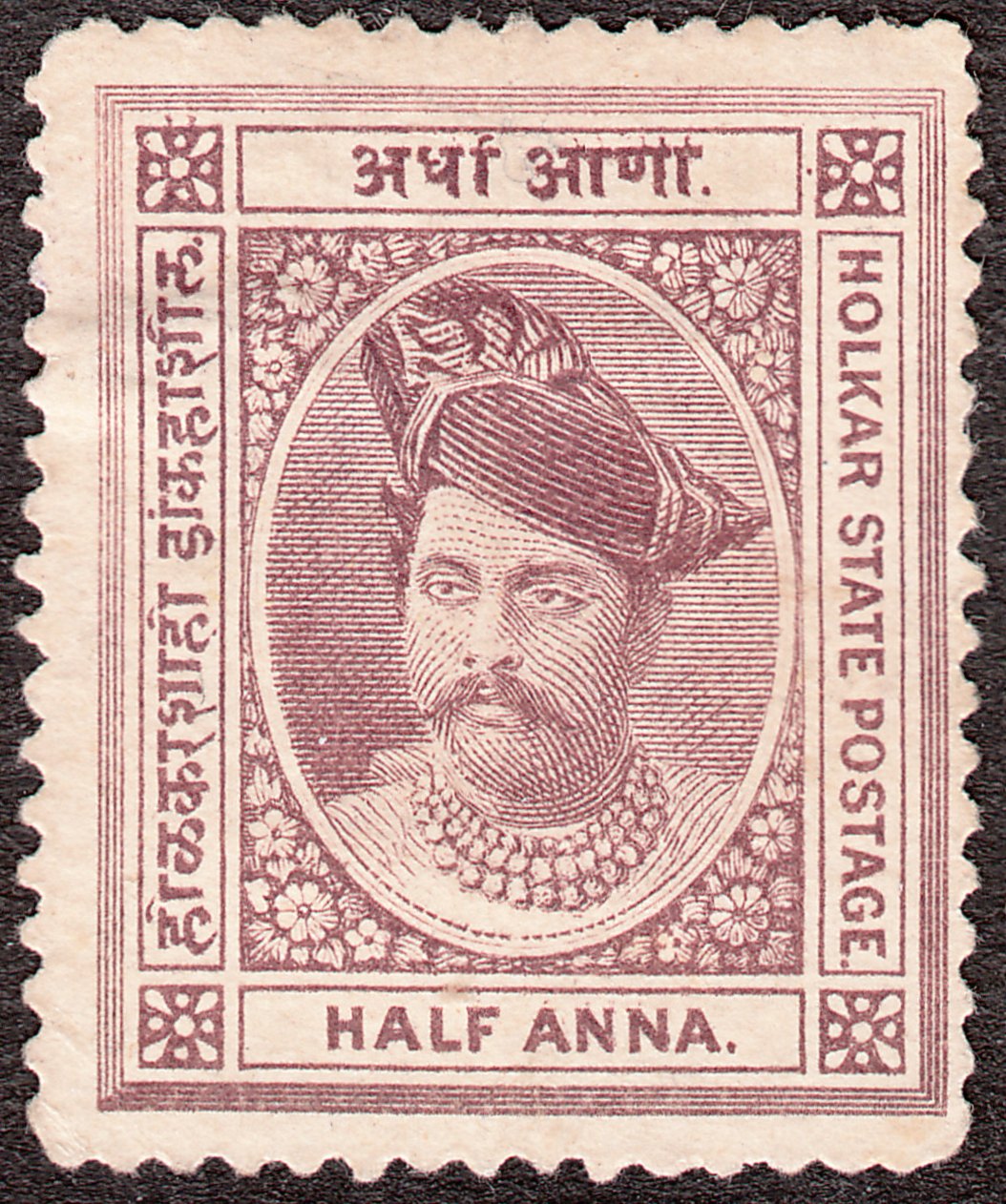 Diese als Indore MiNr. 2 b katalogisierte Freimarke zu 1/4 Anna in lilabraun mit dem Kopfbild von Maharadscha Schiwadschi Rao Holkar erschien 1890: