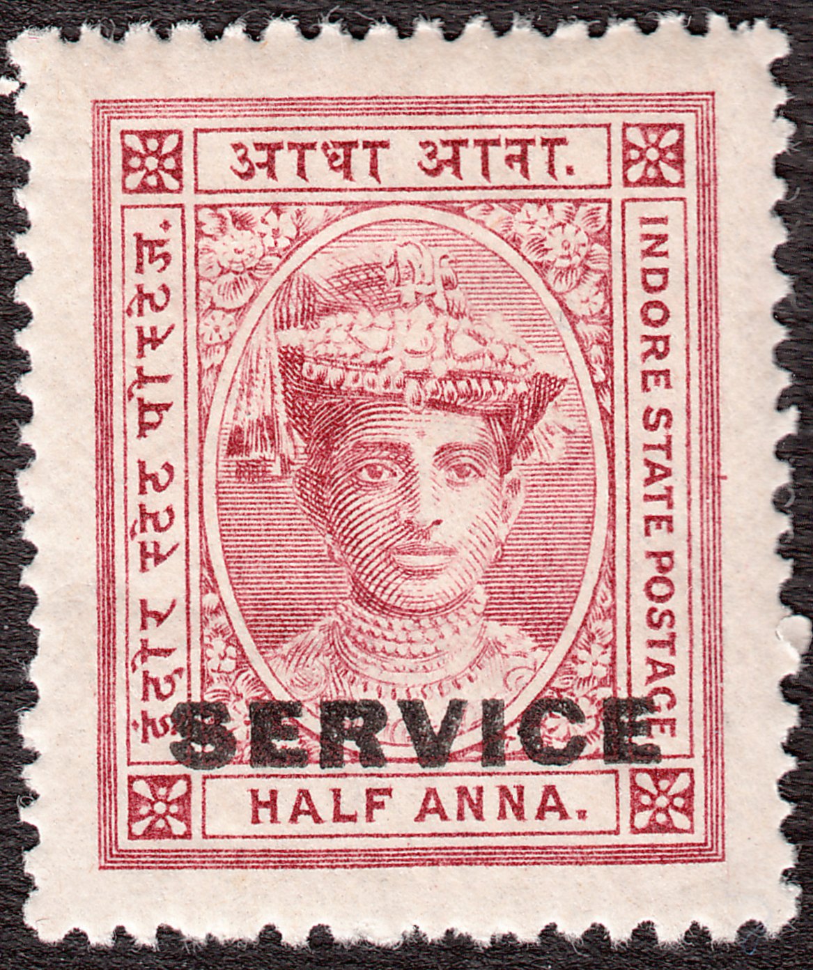 Die Freimarke Indore MiNr. 8 wurde mit schwarzem Aufdruck "SERVICE" versehen als Indore Dienstmarke MiNr. D 2 ausgegeben: