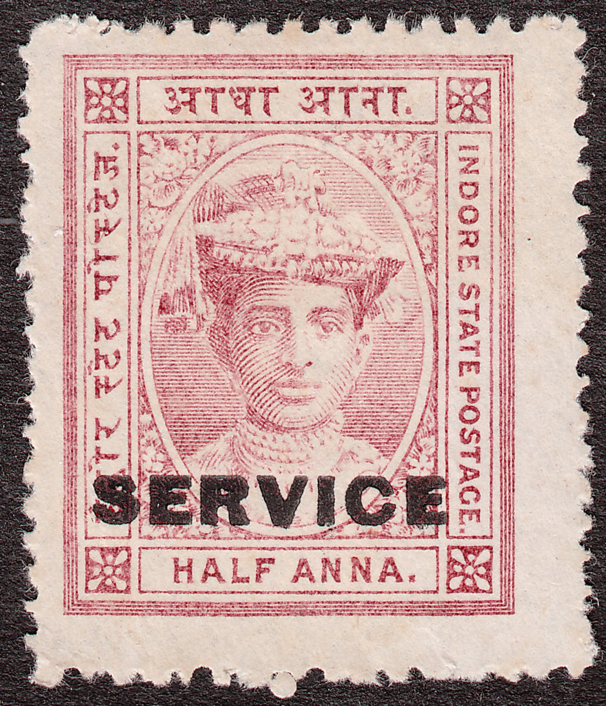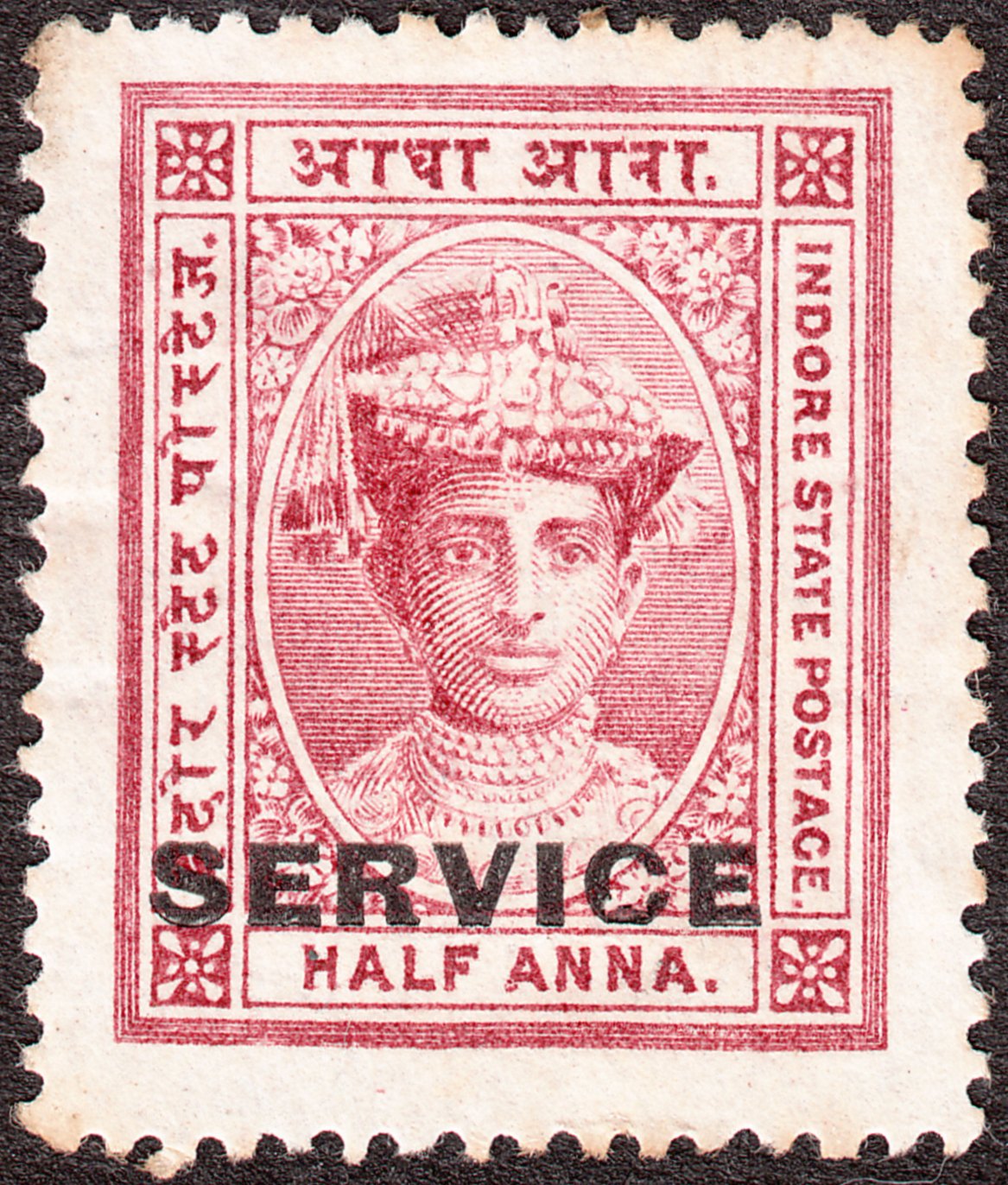 Die Freimarke Indore MiNr. 8 wurde mit schwarzem Aufdruck "SERVICE" versehen als Indore Dienstmarke MiNr. D 2 ausgegeben:
