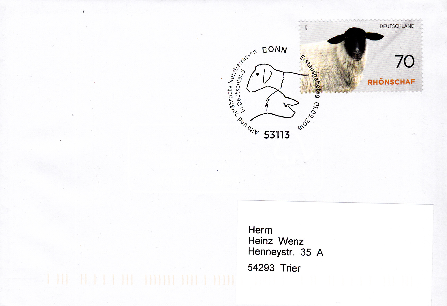 Hier ist eine Marke zu 70 Cent aus dem Block auf einem Brief mit dem Ersttagsonderstempel aus Bonn entwertet. Im Bild des Stempels werden auch ein Schaf und ein Schwein gezeigt.