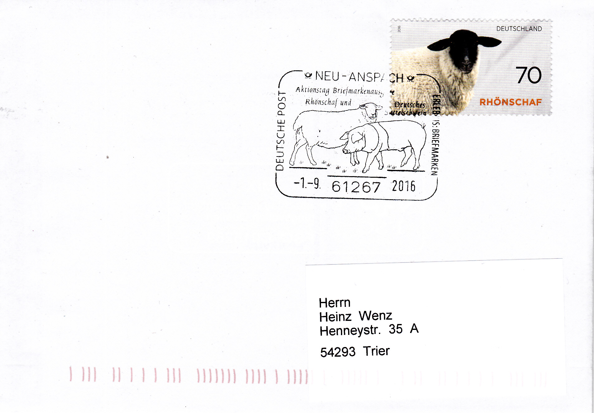 Am Ausgabetag des Blockes "Gefährdete Nutztierrassen" gab es auch in Neu-Anspach zum Aktionstag im Freilichtmuseum Hessenpark zu dieser Briefmarkenausgabe einen Sonderstempel mit einem Rhönschaf und einem Sattelschwein im Stempelbild. Hier ein Brief mit der 70Pf-Marke aus dem Block und diesem dazu passenden Sonderstempel.