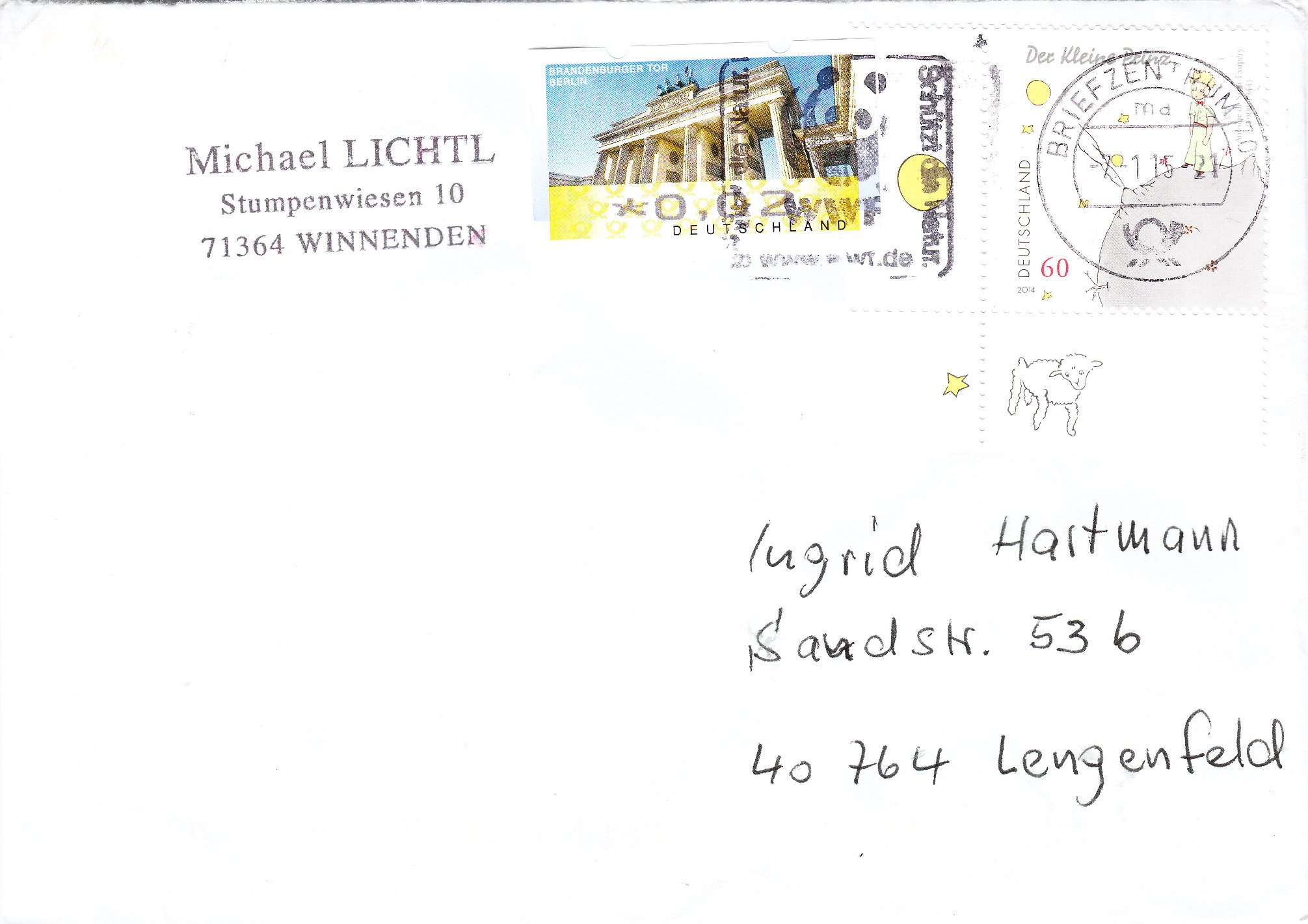 Hier ein Brief mit der linken unteren Ecke des Zehnerbogens der naßklebenden Ausgabe mit einem Schaf als Motiv auf dem Bogenrand gemäß dem Zitat aus der Geschichte "Zeichne mir ein Schaf":