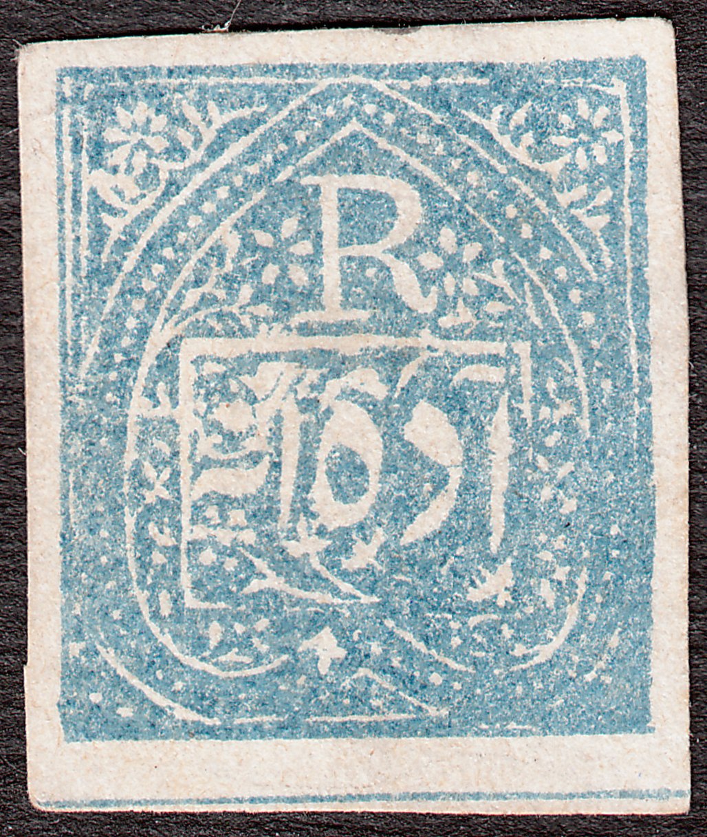 Die Freimarke Jind MiNr. 1 zu 1/4 Anna in blau erschien 1876 auf dickem bläulichem, waagerecht gestreiftem Papier. Diese Version wurde katalogisiert als Jind MiNr. 1 y: