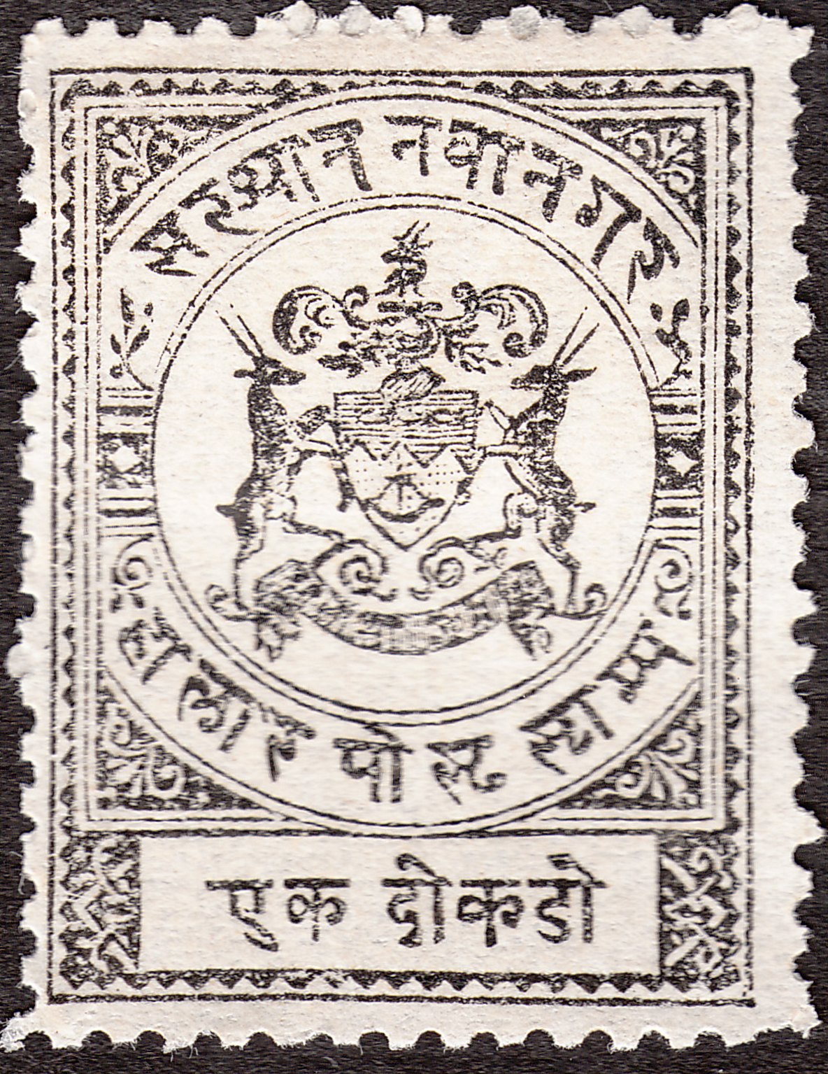 Diese Freimarke zu 1 Dokra in schwarz mit Inschrift in Devanagari-Schrift erschien 1893 in Nawanagar und ist katalogisiert als MiNr. 6: