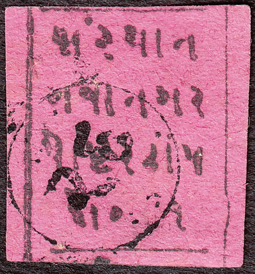 Als Nawanagar MiNr. 3b erschien diese Freimarke zu 1 Dokra schwarz auf rosa mit vierzeiliger Gudscheratischrift im Linienrechteck: