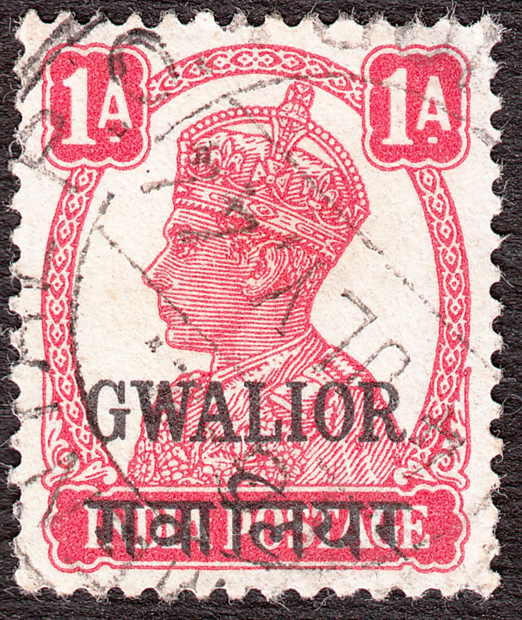 Die Freimarke zu 1 Anna karmin, Indien MiNr. 168, wurde am 20.05.1943 mit einem zweisprachigen Aufdruck des Landesnamens in Devanagari und Englisch als Gwalior MiNr. 105 herausgegeben: