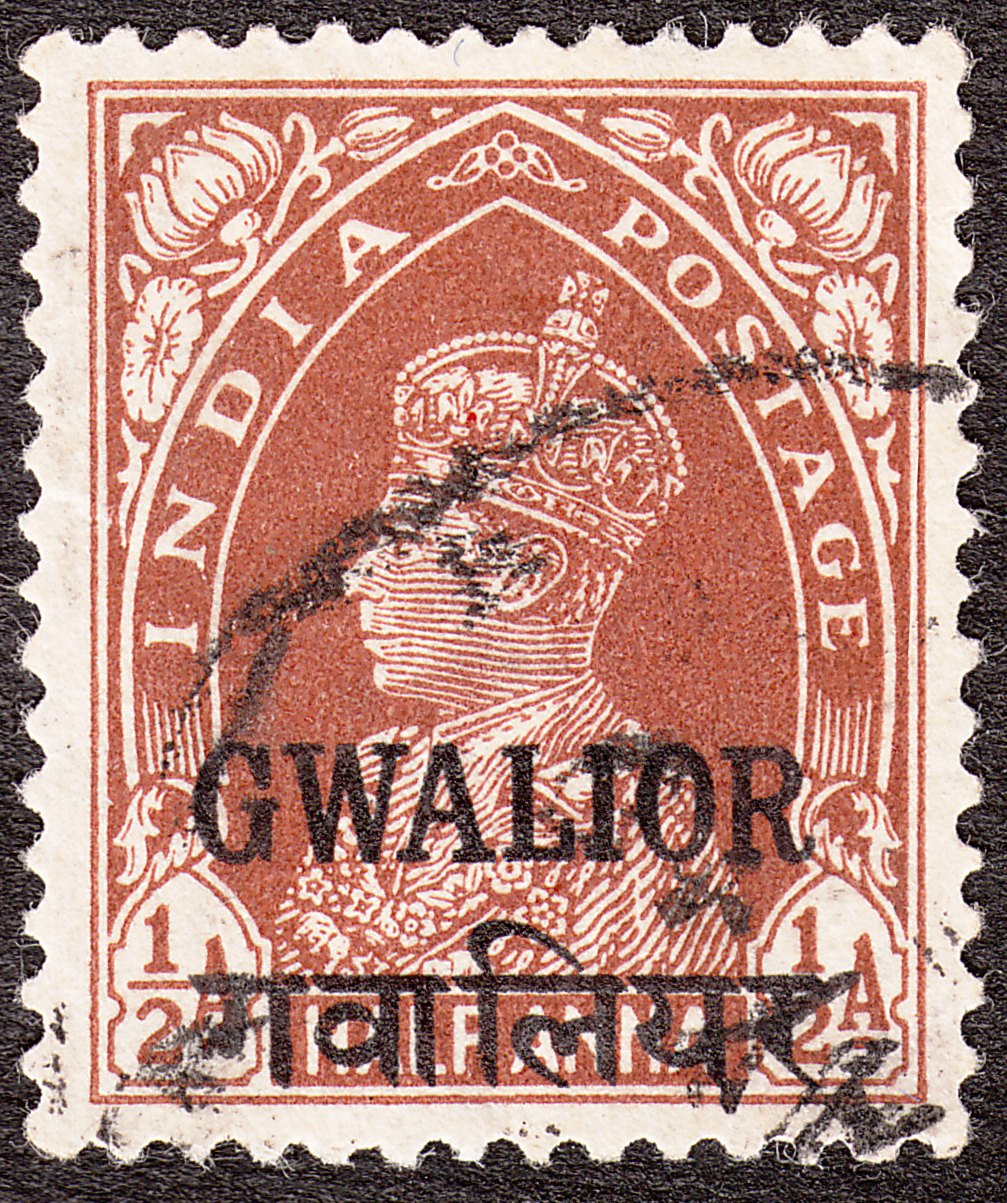 Die Freimarke Indien MiNr. 147 zu 1/2 Anna in rotbraun wurde in Gwalior mit schwarzem Aufdruck versehen ausgegeben und als Gwalior MiNr. 90 katalogisiert: