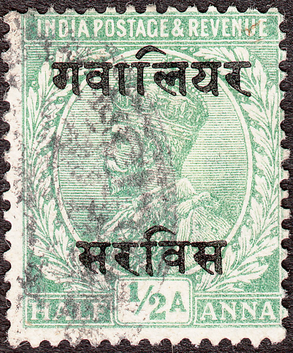 Die Freimarke Indien MiNr. 76 wurde 1913 mit zweizeiligem schwarzem Aufdruck in Devanagarischrift, oben "Gwalior", unten "Sarvis" = Dienst, versehen als Dienstmarke Gwalior MiNr. D 22 ausgegeben: