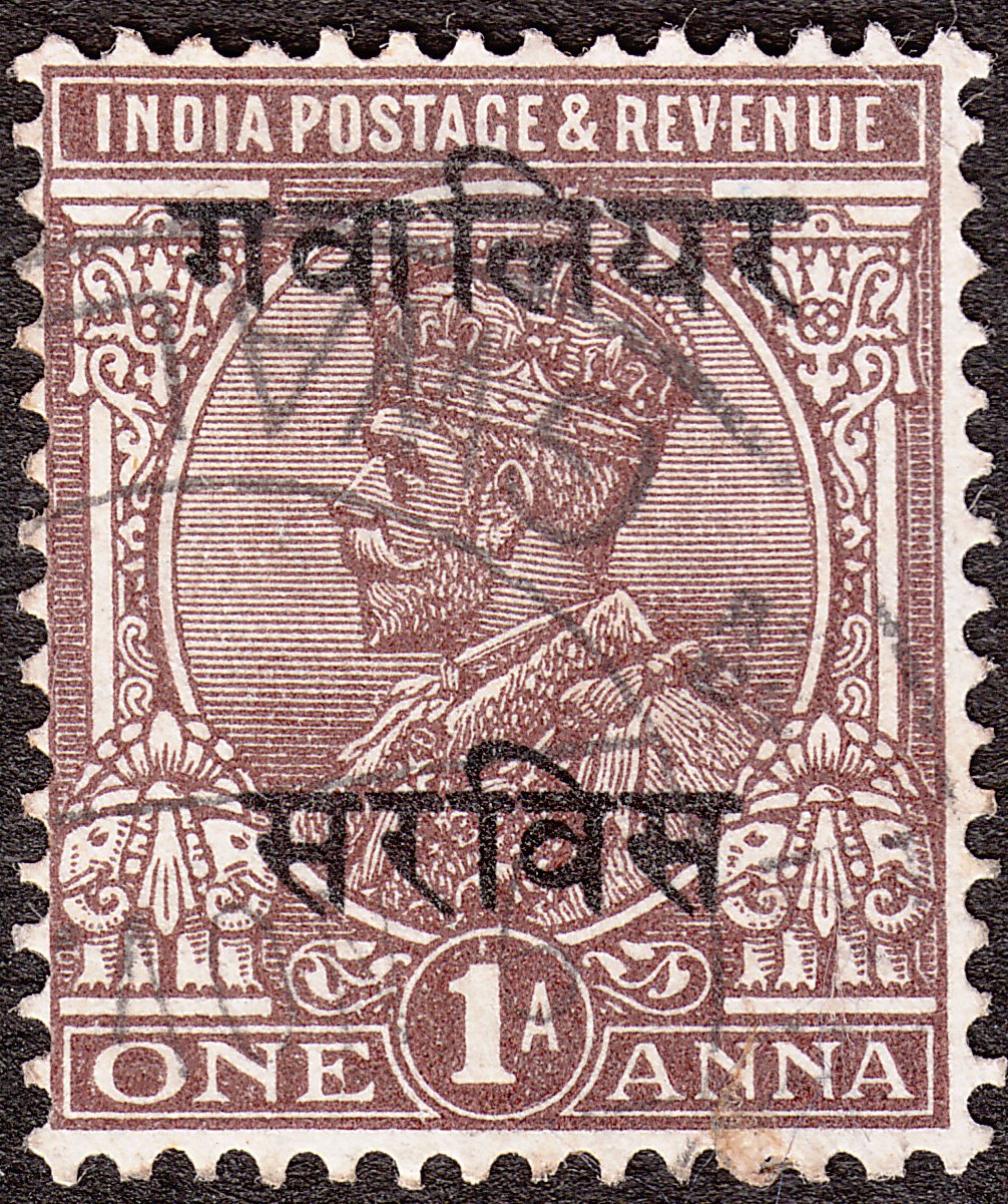 Die Freimarke Indien MiNr. 102 zu 1 Anna in braun wurde mit schwarzem Aufdruck versehen als Dienstmarke ausgegeben und als Gwalior MiNr. D 33 katalogisiert: