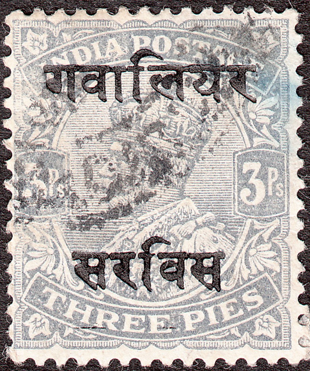 Die Freimarke Indien MiNr. 75 wurde 1913 mit zweizeiligem schwarzem Aufdruck in Devangarischrift, Gwalior oben, Sarvis = Dienst unten, versehen als Dienstmarke Gwalior MiNr. D 21 ausgegeben: