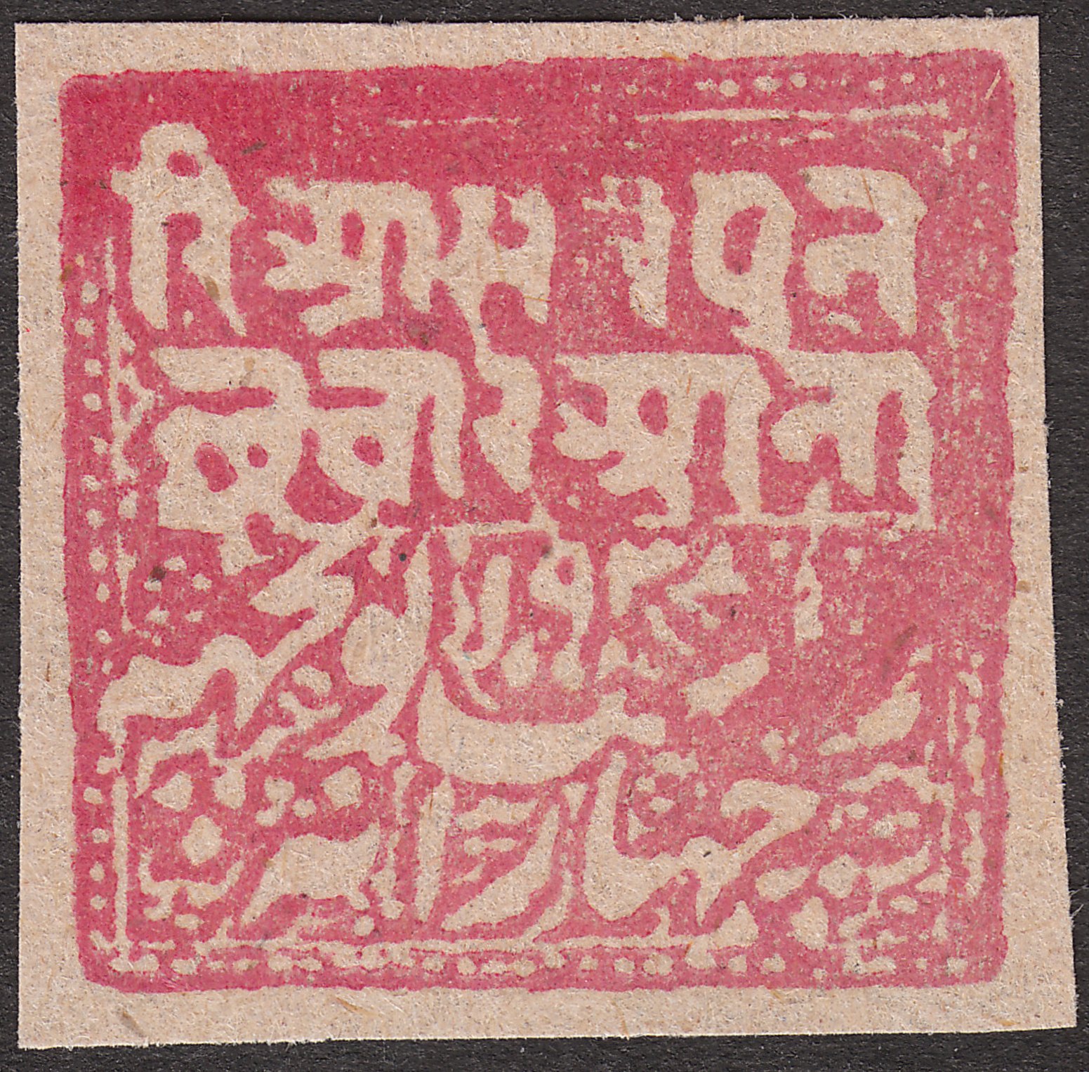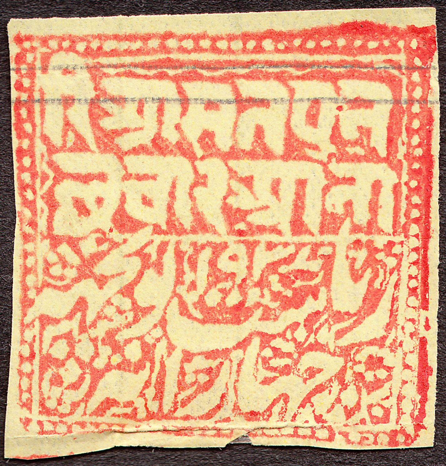 1880 erschien die Freimarkenausgabe zu 4 Annas in rot, katalogisiert als MiNr. 6, auf vier verschieden farbigen Papieren, weiß, gelb, blaugrün sowie orange.
