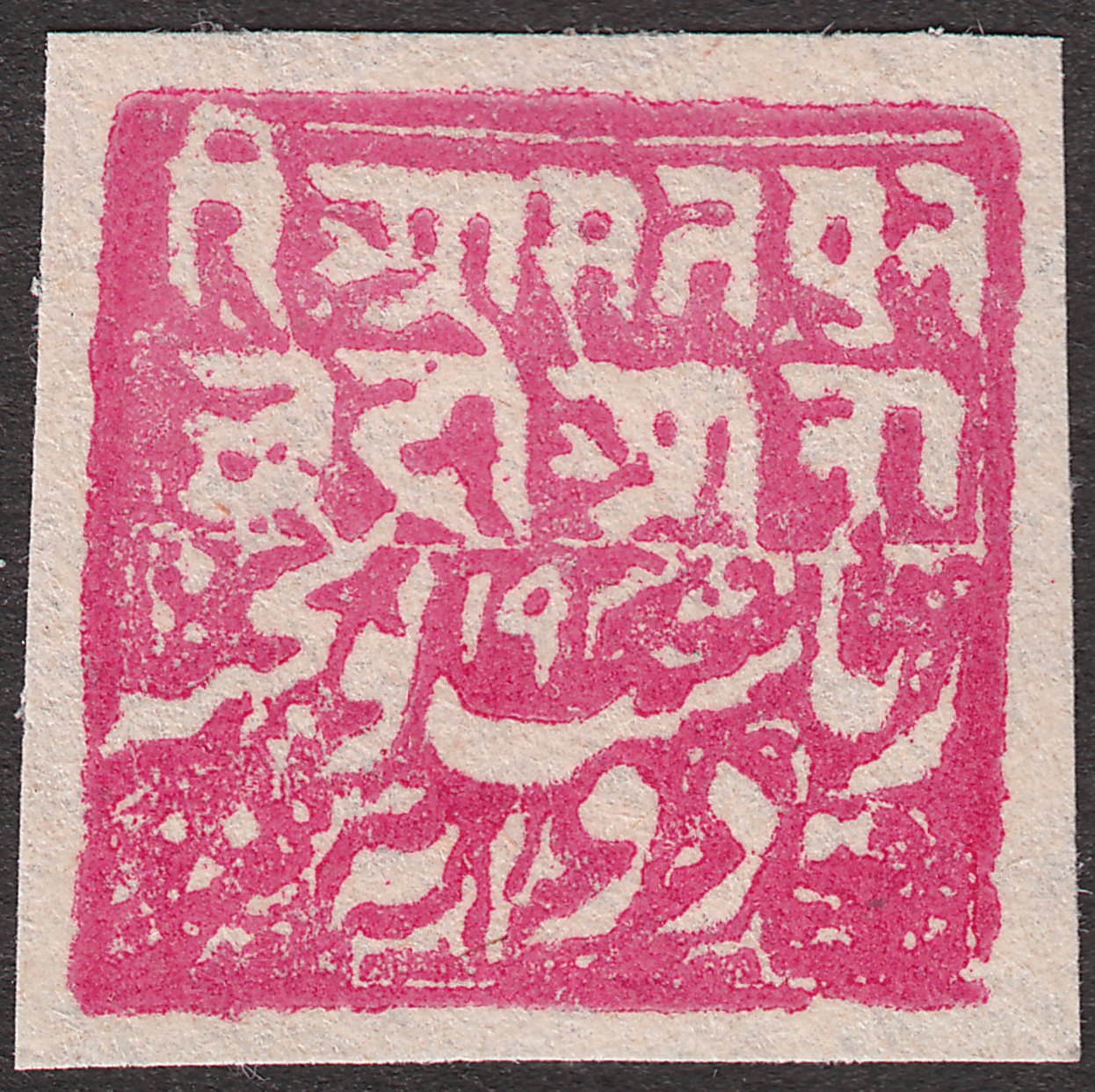 Diese Freimarke zu 2 Annas in rot, katalogisiert als MiNr. 5, erschien 1880 auf fünf verschieden farbigen Papieren, weiß, gelb, blaugrün, lila sowie orange.