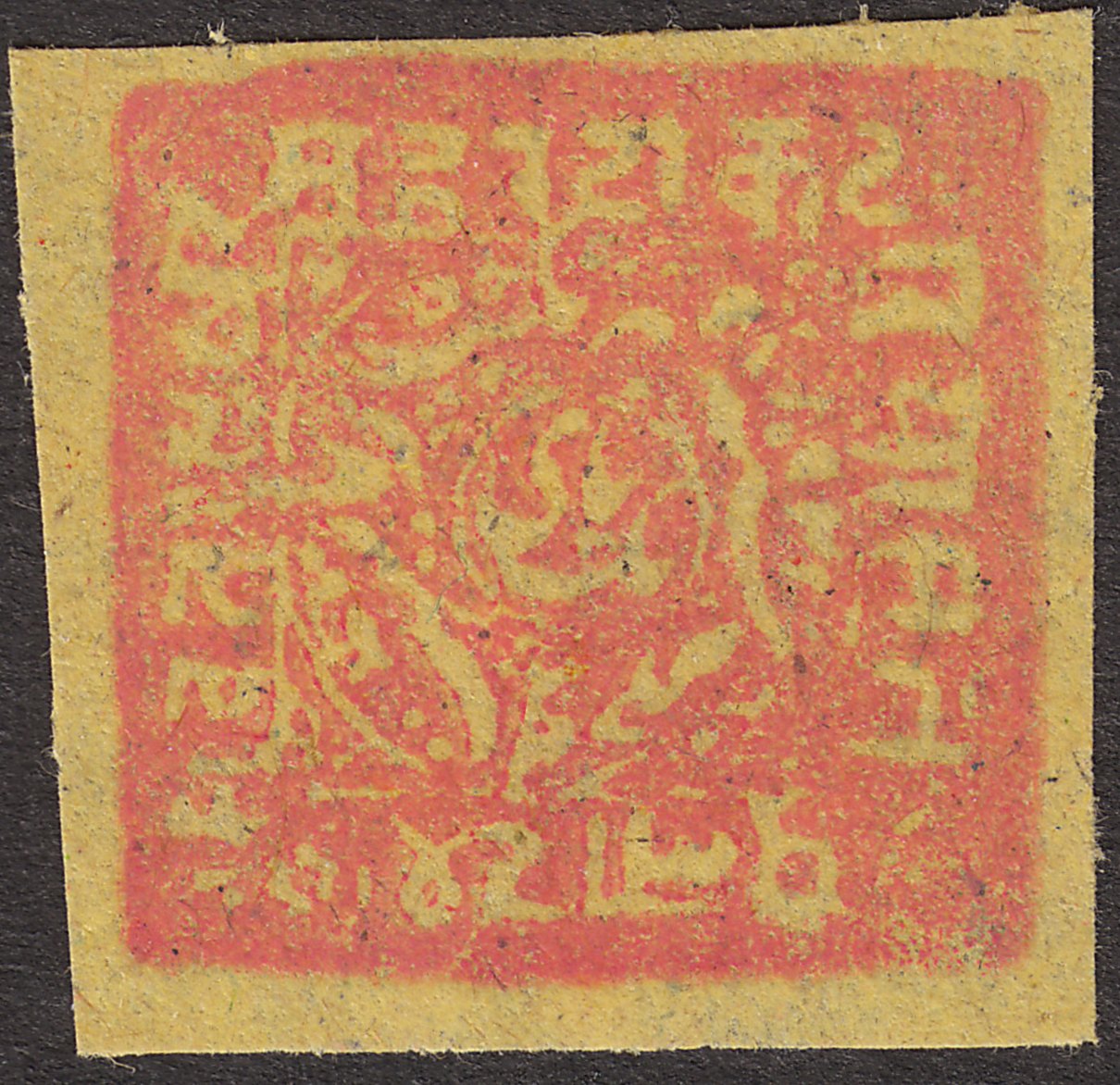 Im Feudalstaat Punch erschien 1885 diese Freimarkenausgabe als Handstempel auf verschiedenfarbigen Papieren mit Inschriften in Devanagari-Schrift sowie in persischer Schrift, hier ein Exemplar auf Papier der Farbe weiß, katalogisiert als MiNr. 7 a:
