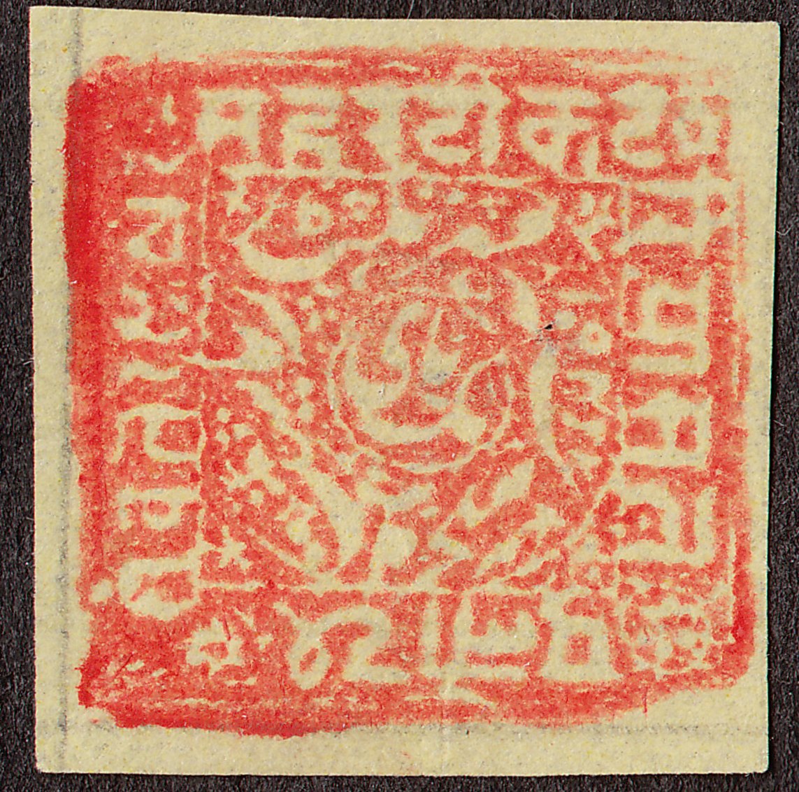 Im Feudalstaat Punch erschien 1885 diese Freimarkenausgabe als Handstempel auf verschiedenfarbigen Papieren mit Inschriften in Devanagari-Schrift sowie in persischer Schrift, hier ein Exemplar auf Papier der Farbe weiß, katalogisiert als MiNr. 7 a: