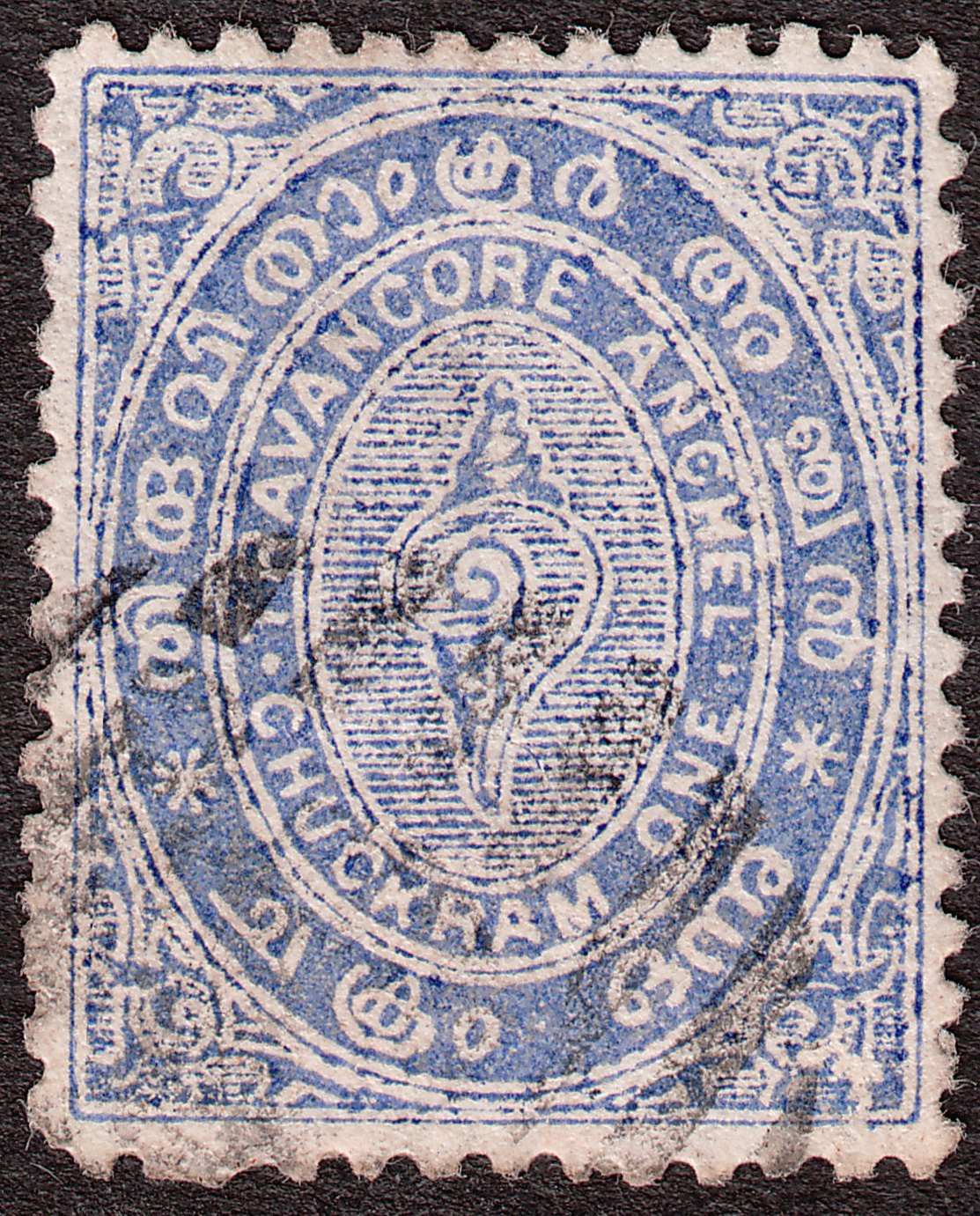 Die Freimarke Travancore MiNr. 6 zu 1 Chukram in ultramarin wurde auf einfachem, nicht gestreiftem Papier gedruckt: