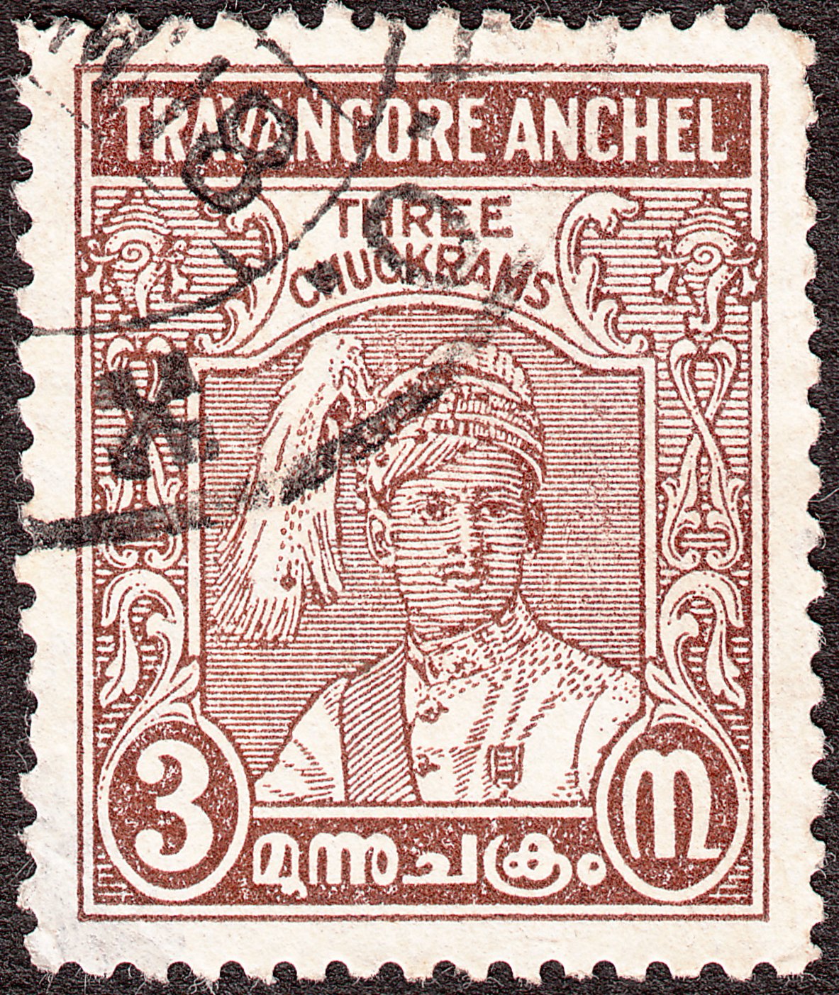 Diese Sonderausgabe zu 3 Chukrams in braun erschien am 09.11.1939 zum 27. Geburtstag des Maharadschas Sir Bala Rama Varma X. und zeigt den Maharadscha: