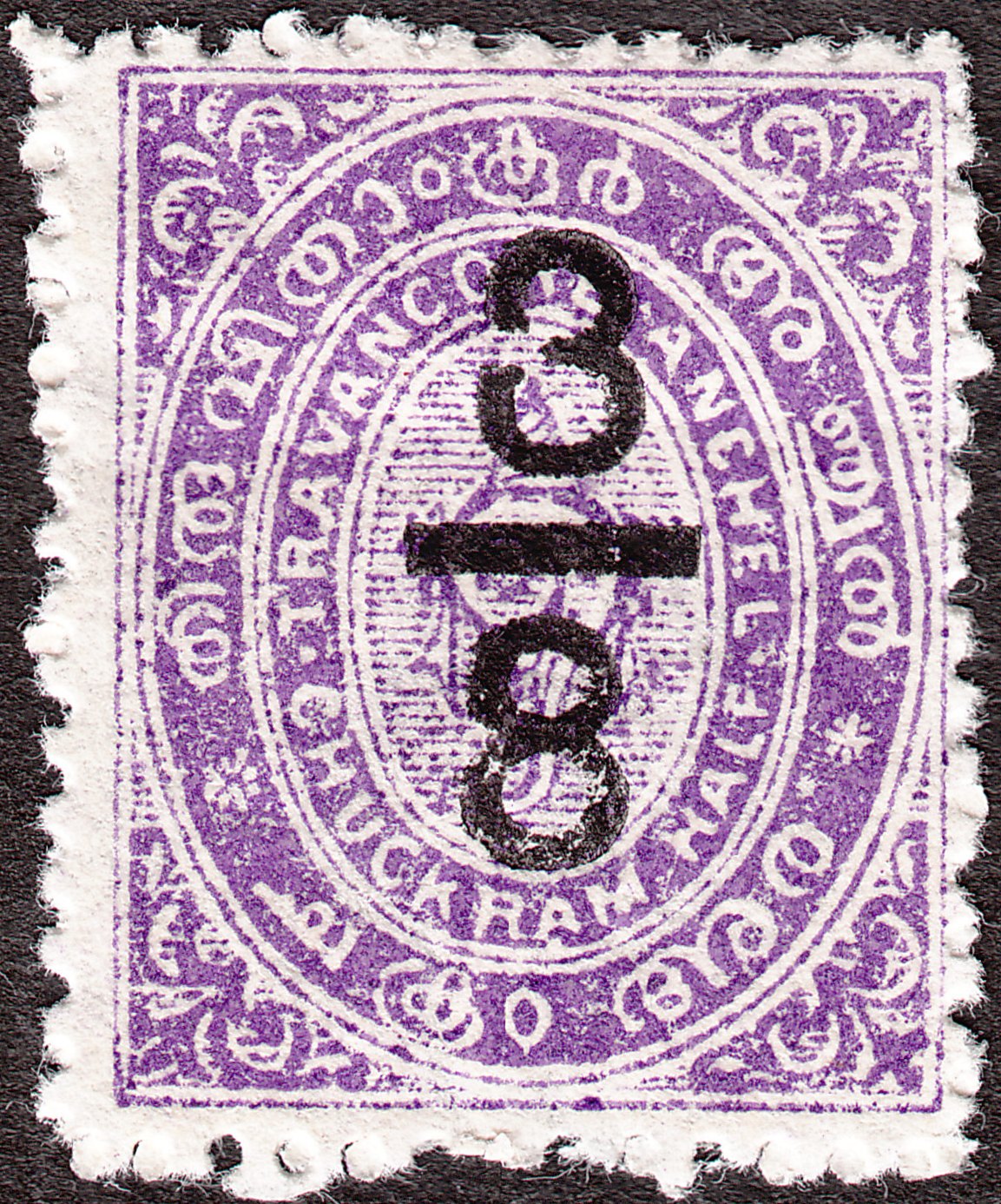 Die Freimarke Travancore MiNr. 4 zu 1/2 Chukram in lila wurde 1906 mit schwarzem Aufdruck des neuen Wertes "3/8" versehen ausgegeben und als Travancore MiNr. 10 katalogisiert: