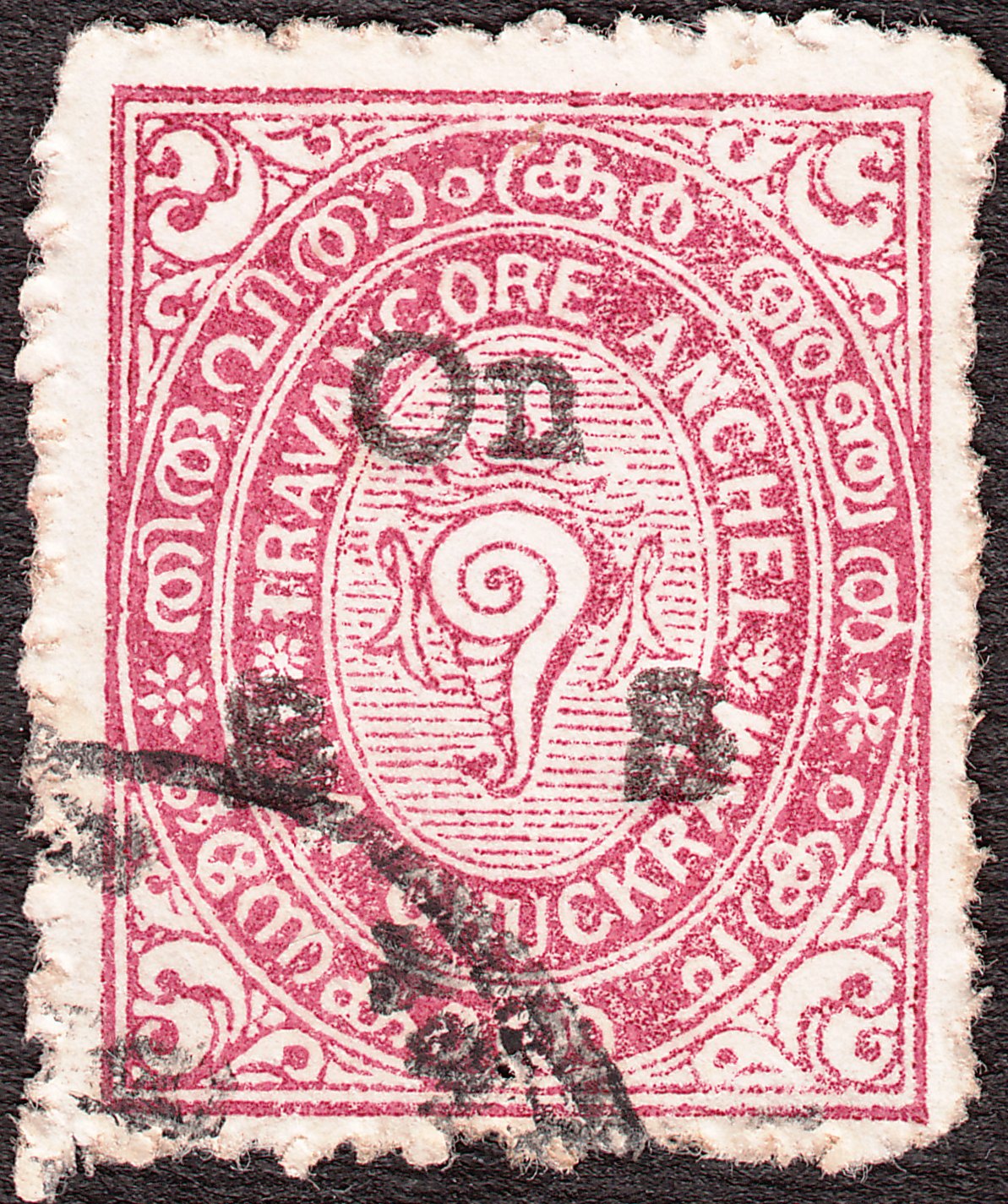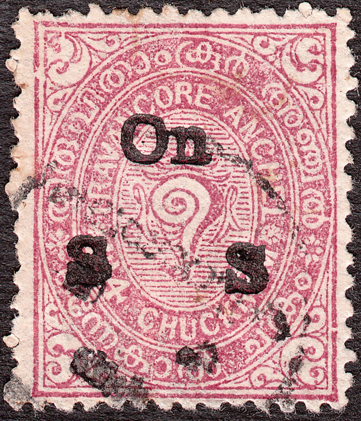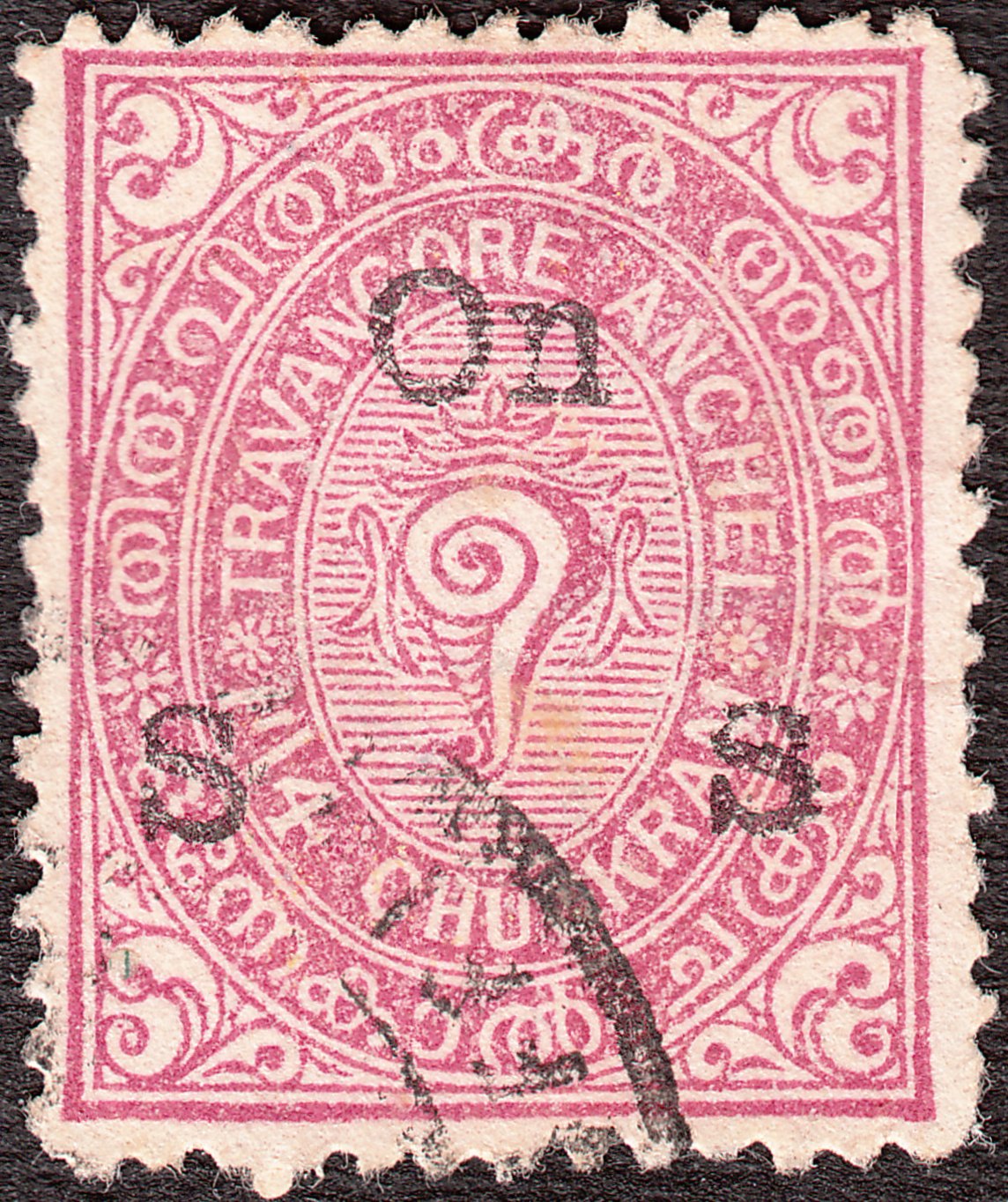 Die Freimarke Travancore MiNr. 17 zu 1 1/4 Chukram wurde mit schwarzem Aufdruck "On S S" versehen als Dienstmarke Travancore MiNr. D 4 ausgegeben: