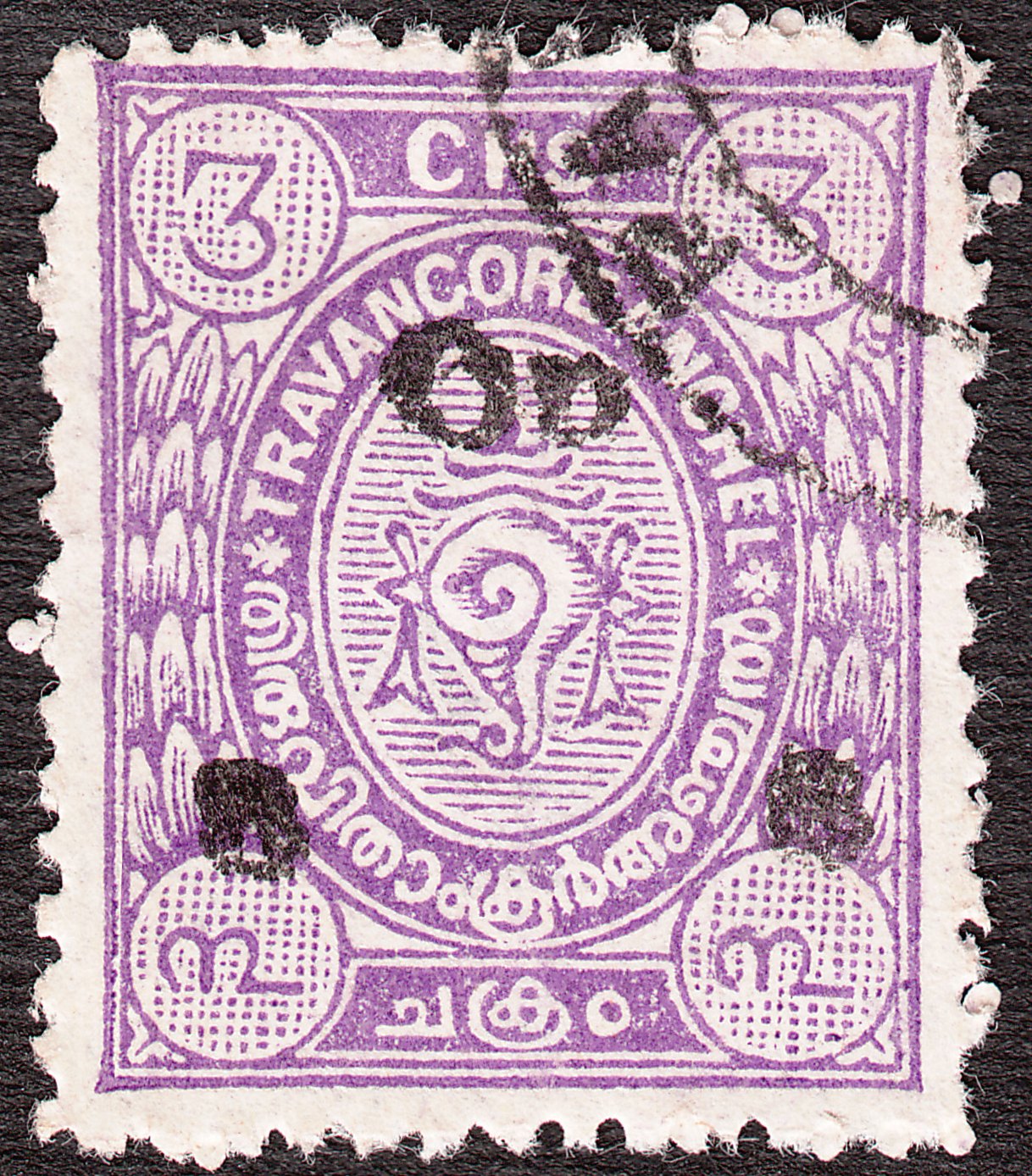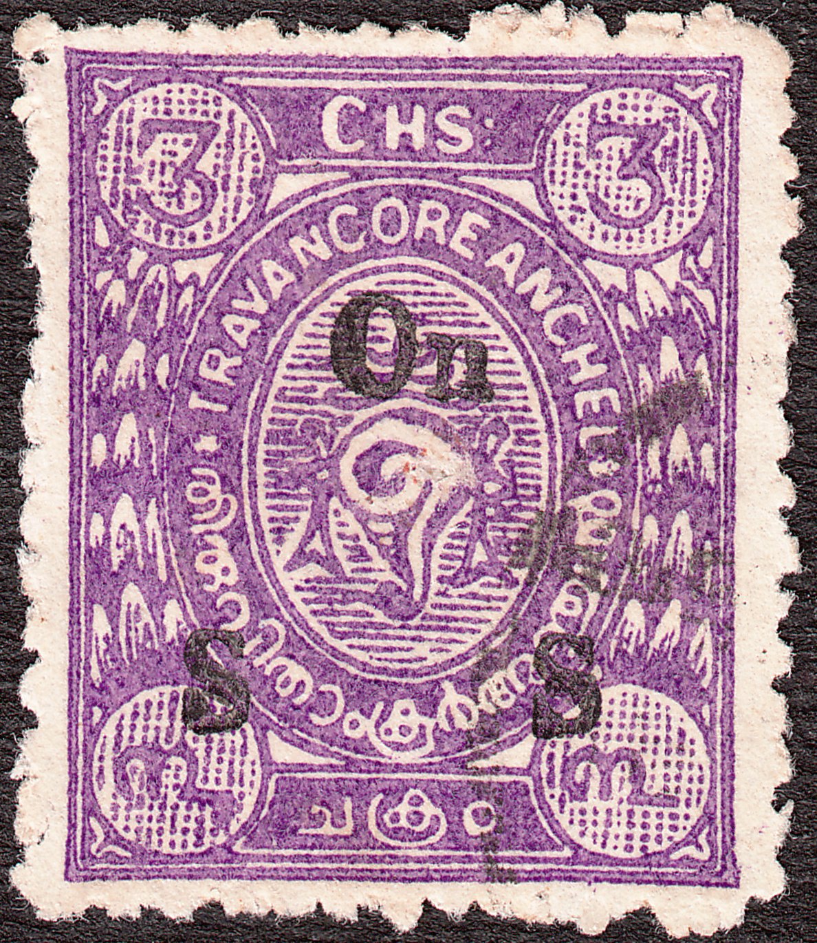 Die Freimarke zu 3 Chukrams in violett, Travancore MiNr. 15, wurde mit schwarzem Aufdruck "On S S" in Type II versehen als Dienstmarke ausgegeben, die als Travancore MiNr. D 32 katalogisiert wurde:
