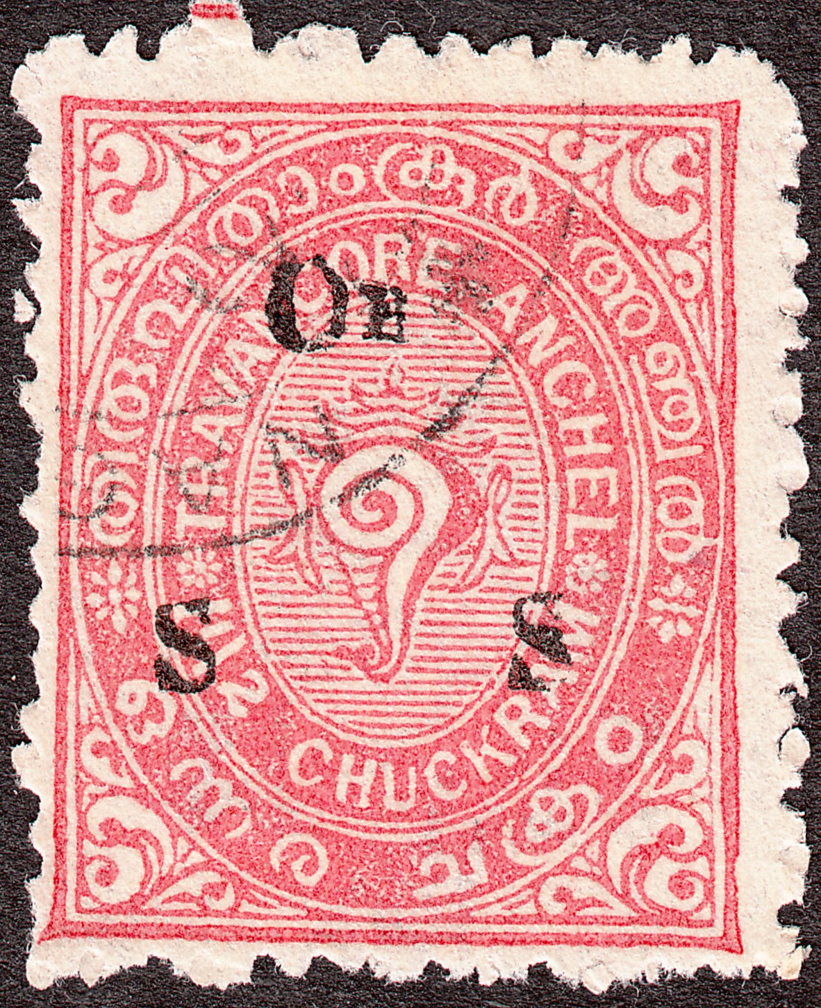 Die Freimarke Travancore MiNr. 32 wurde 1933 mit schwarzem Aufdruck "On S S" versehen als Dienstmarke Travancore MiNr. D 31 ausgegeben.