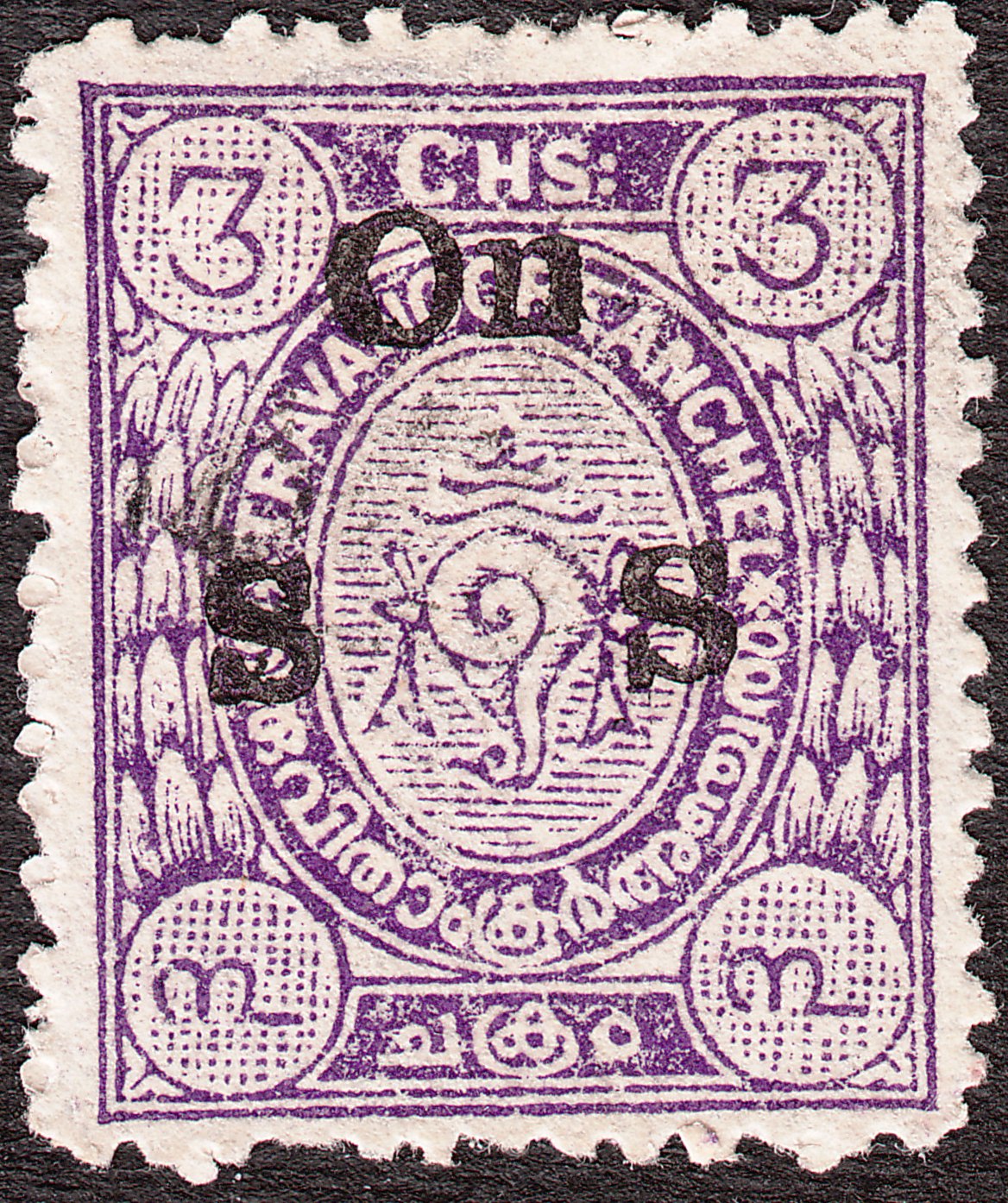Die Freimarke zu 3 Chukrams in violett, Travancore MiNr. 15, wurde mit schwarzem Aufdruck "On S S" versehen als Dienstmarke ausgegeben, die als Travancore MiNr. D 6 katalogisiert wurde: