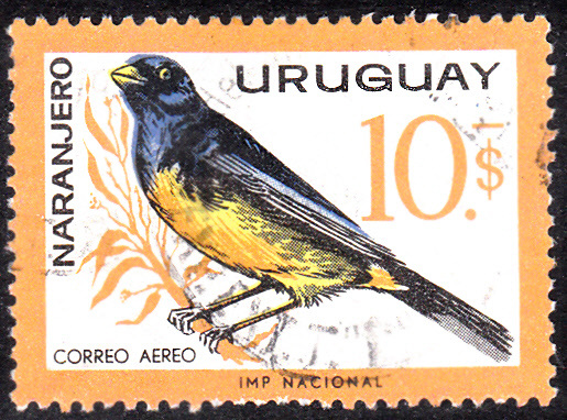 Diese Marke aus Uruguay (MiNr 951) zeigt eine Furchentangare (Thraupis bonariensis).