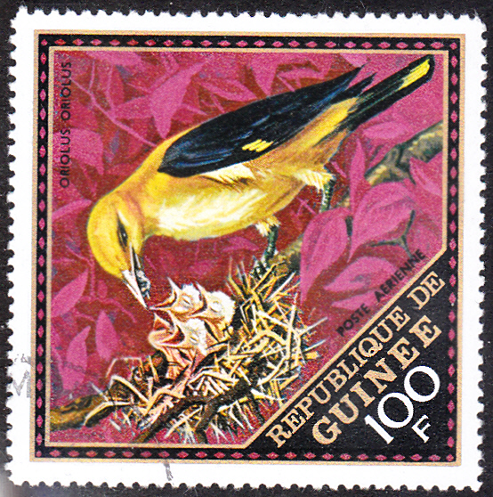 In Guinea ist diese Marke (MiNr 588 A) mit einem Pirol (Oriolus oriolus) beim Füttern der Brut erschienen.
