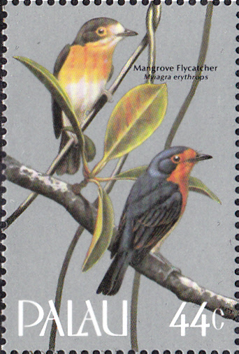 Hier eine Marke der Palau-Inseln (MiNr 101), die ein Männchen und ein Weibchen dieser Vogelart abbildet. Das Männchen ist der Vogel mit dem intensiven Rot.