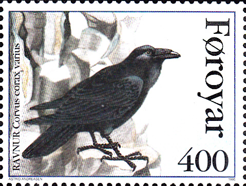 Auf dieser Marke aus Dänemark Färöer (MiNr 283) wird ein Färöer-Kolkrabe (Corvus corax varius) gezeigt dessen Gefieder verglichen mit der Nominatform nicht so stark glänzend und die Unterseite mehr grünlich schwarz ist.