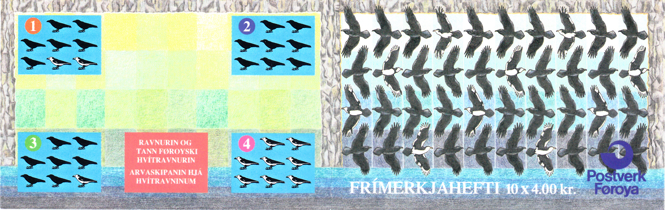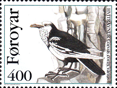 Auf dieser Marke aus Dänemark Färöer (MiNr 284) wird ein solcher Färöer-Kolkrabe (Corvus corax varius) gezeigt.