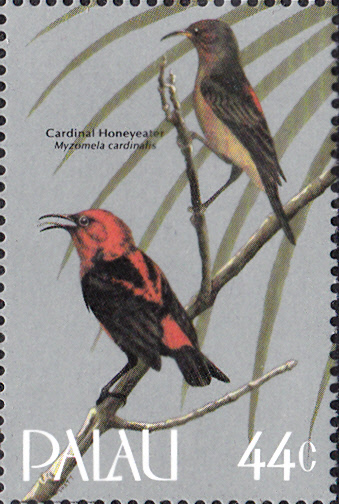 Hier eine Marke der Palau-Inseln (MiNr 102) mit einem Pärchen des Kardinal Honigfresser (Cardinal Myzomela). Der rote Vogel ist das Männchen. Es gibt aber offenbar auch abweichende Namen: Michel bezeichnet diesen Vogel mit Kardinalhonigschmecker (Myzomela cardinalis).