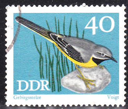 Auf dieser Marke aus der DDR (MiNr 1840) wird uns eine Gebirgsstelze (Motacilla cinerea) vorgestellt.