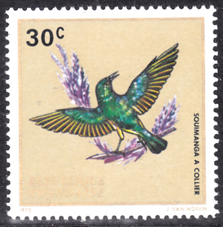 In Kenia ist diese Marke (MiNr 581) mit einem Rotbrust-Glanzköpfchen (Chalcomitra senegalensis, Syn.: Nectarinia senegalensis)m erschienen. Michel nennt als Name Rotbrustnektarvogel (Nectarinia senegalensis).