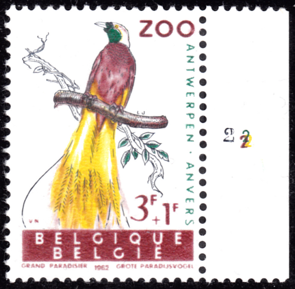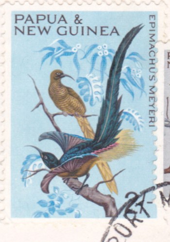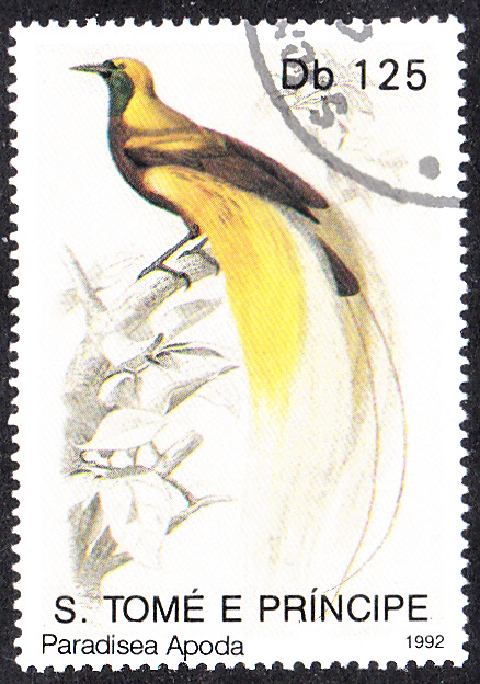 Auf diese Marke (MiNr 1355) aus Sao Tomé und Principe (ein Inselstaat im Golf von Guinea) wird ein Männchen des Großen Paradiesvogel (Paradisaea apoda) gezeigt.
