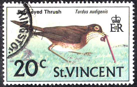 Auf dieser Marke aus einer Freimarkenserie "Einheimische Vögel" aus St. Vincent (MiNr 268) ist eine Nacktaugendrossel (Turdus nudigenis) bei der Nahrungssuche abgebildet.