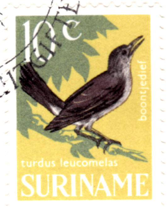 Diese Marke aus Surinam (MiNr 491) zeigt eine Fahlbrustdrossel (Turdus leucomelas).