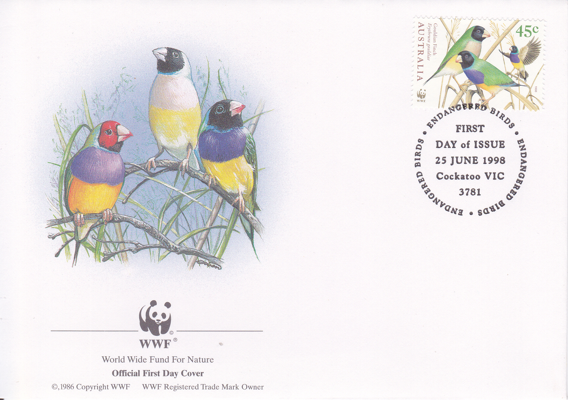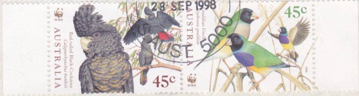 Ebenfalls aus Australien kommt diese Marke (MiNr 1747) mit drei Gouldamadinen (Erythrura gouldiae).