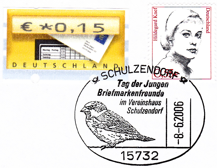 Sonderstempel zum Tag der Jungen Briefmarkenfreunde aus Schulzendorf vom 8.6.2006 mit einem Haussperling im Stempelbild.