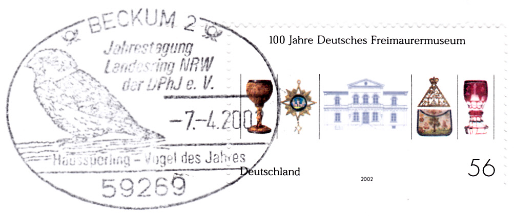 Sonderstempel aus Beckum vom 7.4.2002 Zu Jahrestagung des Landesringes NEW der DPhJ e.V. mit einem Haussperling.