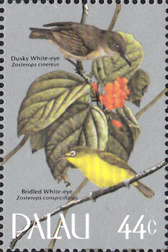 Auf dieser Marke der Palau-Inseln (MiNr 104) sehen wir oben laut Inschrift auf der Marke einen "dusky white-eye". Der lateinische Namen wäre "Zosterops finschii". Angegeben ist auf der Marke aber "Zosterops cinereus". Unter diesem lateinischen Namen ist aber der deutsche Namen Kittlitzbrillenvogel (Zosterops cinereus) zu finden. Andere Quellen nennen unter dem lateinischen Namen "Zosterops finschii" den Palau-Brillenvogel. Der Michel-Katalog nennt den gezeigten Vogel "Graubraunbrillenvogel (Zosterops cinerea)". Nun kann sich jeder den passenden Namen aussuchen!