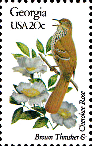 In der Serie "Vögel und Blumen der 50 Bundesstaaten" erschien in den USA eine Marke, (MiNr 1541) die eine Rotrücken-Spottdrossel (Toxostoma rufum) zeigt. Im Michel wird ihr Name mit Rotsichelspötter (Toxostoma rufum) angegeben. Die Marke gibt es in zwei Zähnungen: A = gez. K 11 1/4 und F = gez. L 10 3/4:11 1/4.