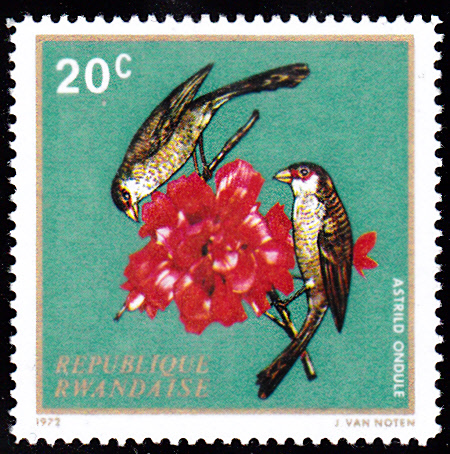 Aus Ruanda kommt diese Marke (MiNr 500 A) mit zwei Wellenastrilde (Estrilda astrild).