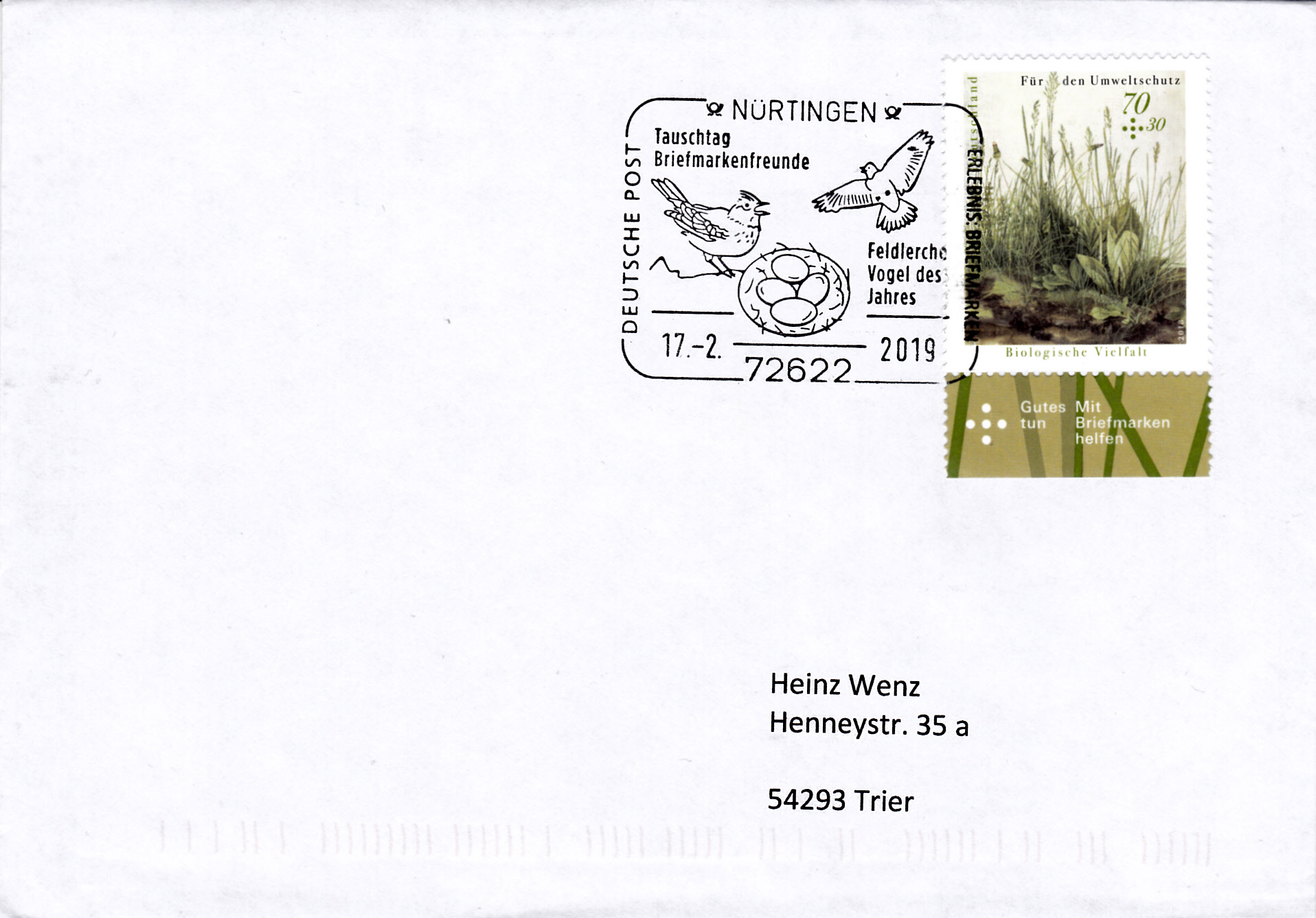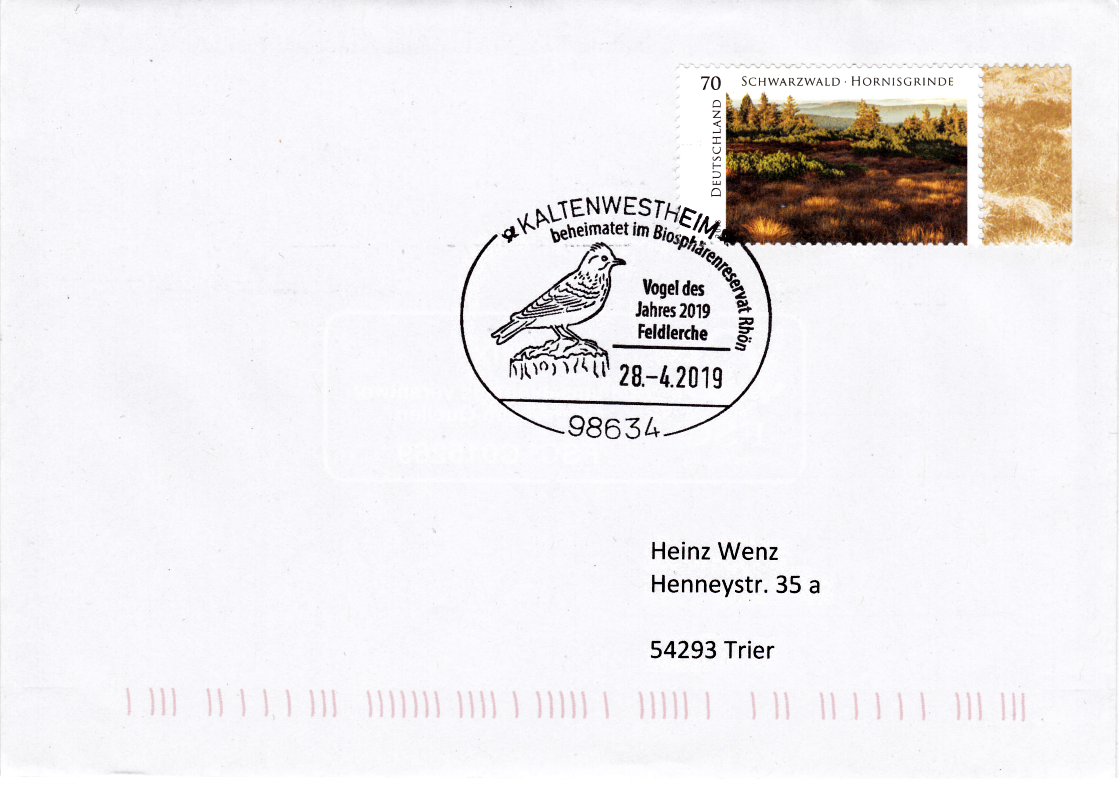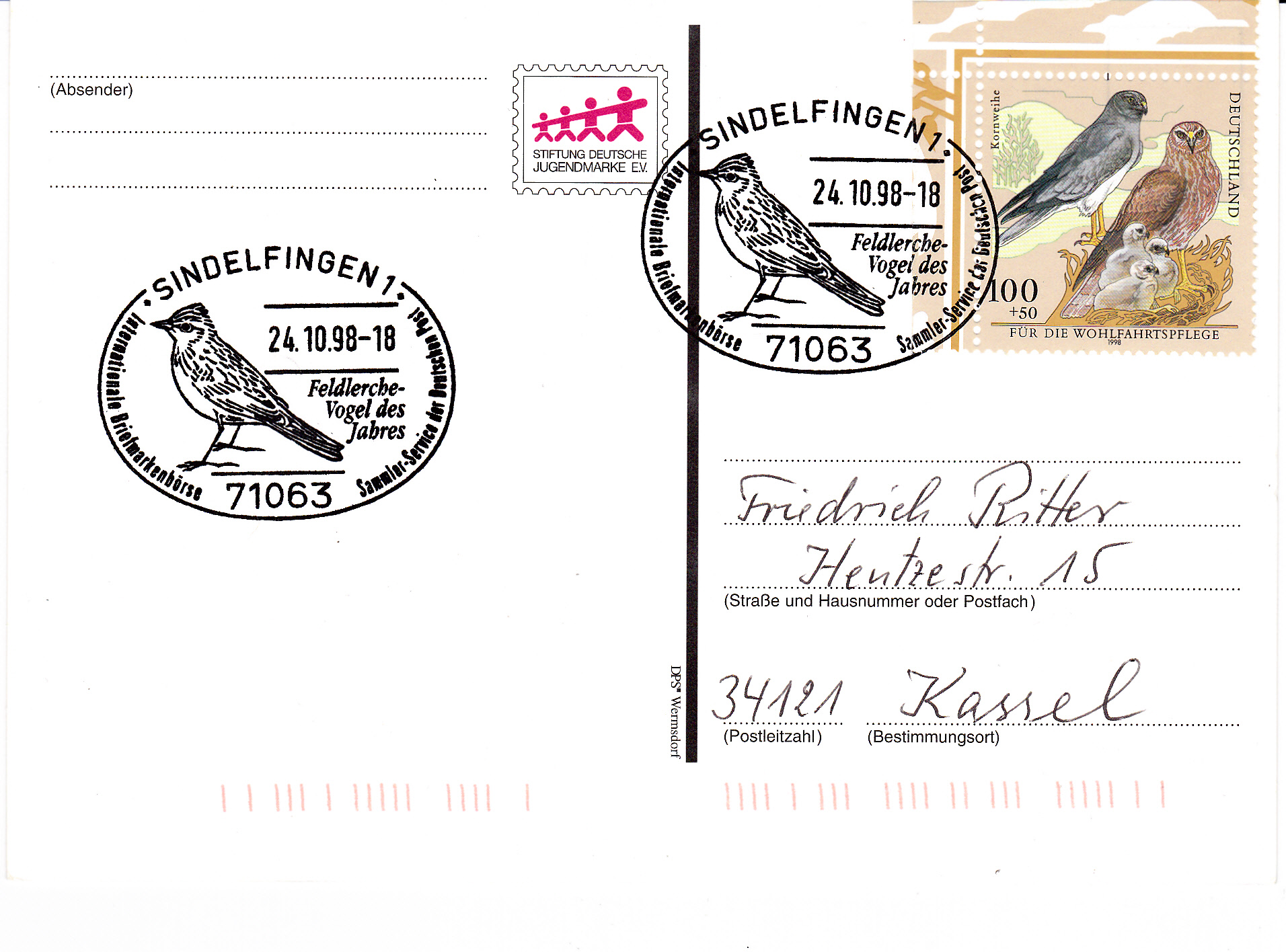Der Sonderstempel vom 23.10.1998 auf diesem Einschreibebrief aus Sindelfingen stellt eine Feldlerche im Stempelbild vor. Anlass war, dass die Feldlerche 1998 Vogel des Jahres war. Das Porto betrug zu dieser Zeit: Brief bis 20 g 110 Pf und Übergabeeinschreiben 400 Pf, zusammen also 510 Pf.