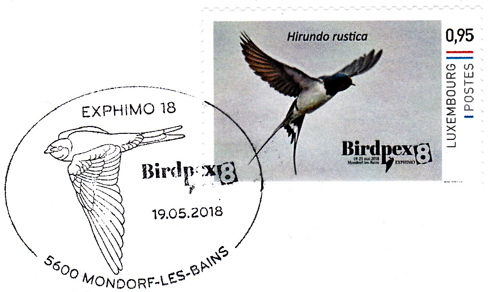Zur Ausstellung Birdpex 8 in Mondorf-les bains gab es auch personalisierte Marken im Eigenauftrag der Post mit einer Rauchschwalbe (Hirundo rustica). Diese Marke zu 0,95€ zeigt eine Rauchschwalbe beim Flug: