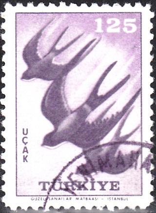 Hier eine Marke aus der Türkei (MiNr 1664) mit Rötelschwalben (Hirundo daurica) beim Flug.