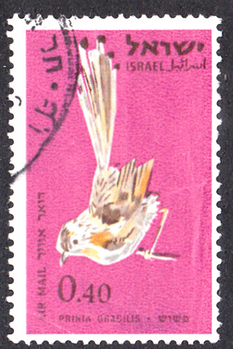 Diese Marke aus Israel (MiNr 274) zeigt uns eine Streifenprinie (Prinia gracilis).